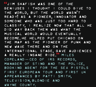 Miles Copeland, founder and CEO of the legendary I.R.S. Records and manager of such artists as Sting and The Police said of Skafish, "Jim Skafish was one of the geniuses I thought I could give to the world, but the world wasn't ready! As a pioneer, innovator and someone who was just too hard to classify, I realize now that all he did way back then was what the musical world would eventually become. He helped put Chicago on the map as the pioneer of Punk and New Wave there and on the international stage, gave audiences a really insane ride." Besides signing such artists as the Go-Go’s and REM to his label, Copeland booked the Sex Pistols on their first European tour and was the first to bring artists such as Television, Patti Smith, Blondie and Wayne County to the UK.