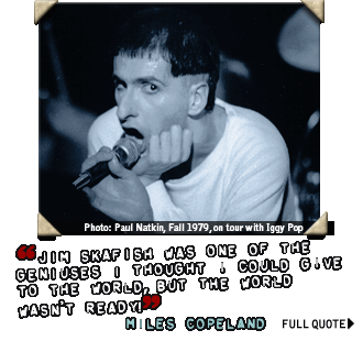 Miles Copeland, founder and CEO of the legendary I.R.S. Records and manager of such artists as Sting and The Police said of Skafish, "Jim Skafish was one of the geniuses I thought I could give to the world, but the world wasn't ready! As a pioneer, innovator and someone who was just too hard to classify, I realize now that all he did way back then was what the musical world would eventually become. He helped put Chicago on the map as the pioneer of Punk and New Wave there and on the international stage, gave audiences a really insane ride." Besides signing such artists as the Go-Go’s and REM to his label, Copeland booked the Sex Pistols on their first European tour and was the first to bring artists such as Television, Patti Smith, Blondie and Wayne County to the UK.