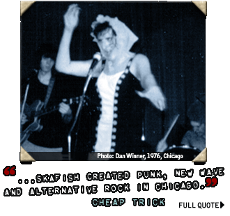 November - December 1976: Skafish is the first Chicago Punk artist to perform a Chicago area club tour. Audience reactions range from shock, bewilderment, cynicism to violence. A hired bodyguard quits after only a few shows.